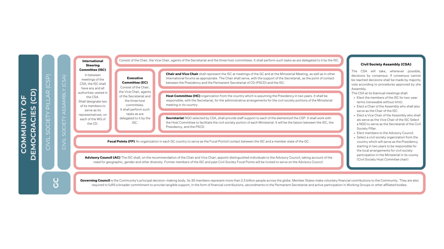 The Civil Society Pillar is represented by the Board of Directors of the International Steering Committee (ISC), an independent body within the Community of Democracies (CoD). This body is elected by the Civil Society Assembly and aims to advise the CoD. The Civil Society Pillar develops its strategies and activities to promote civic space, proposes areas for consideration, and expresses the views of civil society during the deliberations of the ISC Steering Committee.