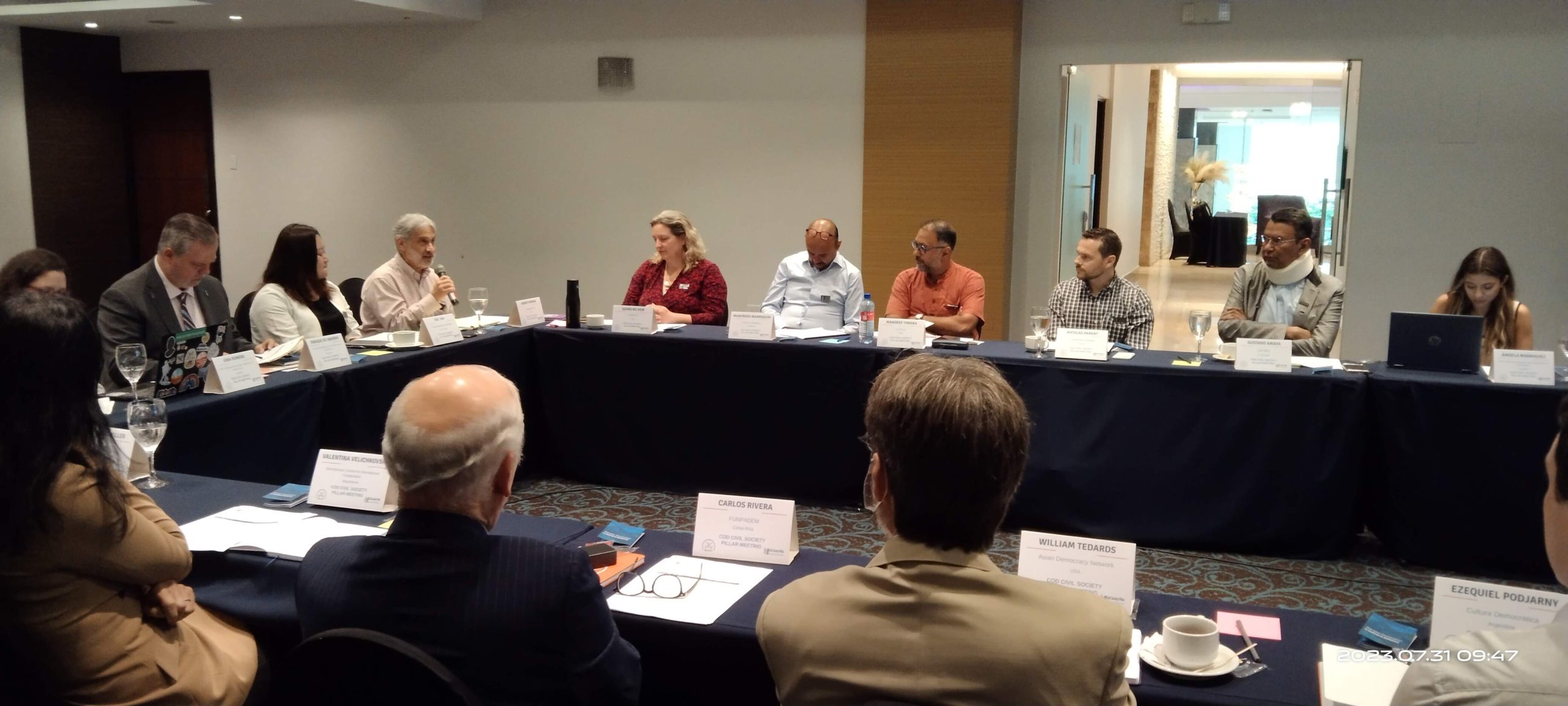 The Civil Society Pillar (CSP) is composed of non-governmental entities, civil society organizations, foundations, regional networks, and global NGOs. Since September 2022, the PSC is chaired by Enrique de Obarrio, current president of REDLAD – Latin American and Caribbean Network for Democracy.